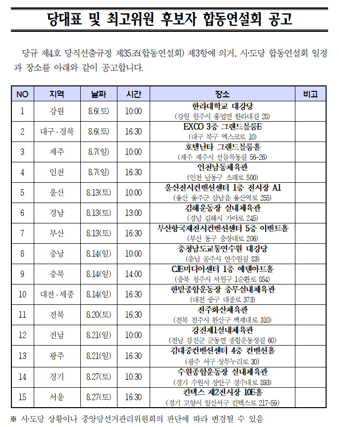 당대표 및 최고위원 후보자 합동연설회 공고