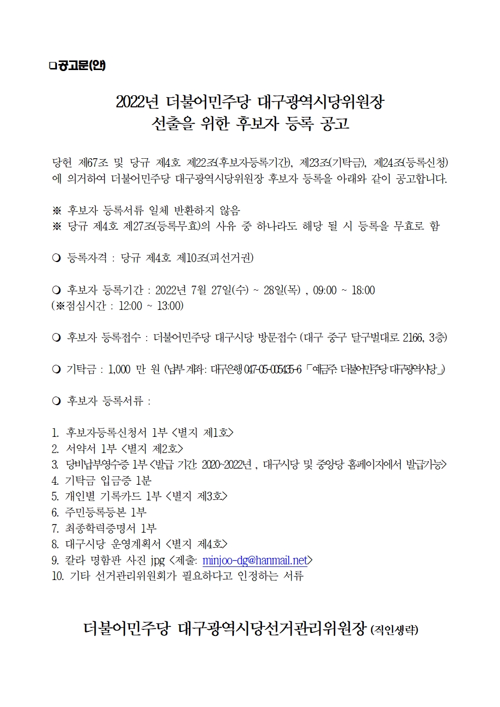 2022년 더불어민주당 대구광역시당위원장 선출을 위한 후보자 등록 공고