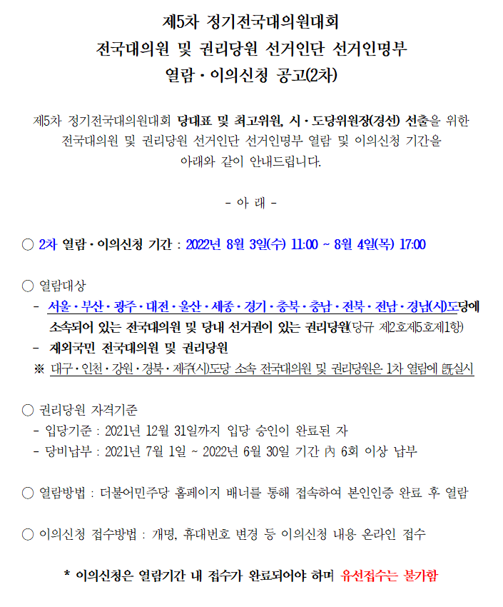 제5차 정기전국대의원대회 선거인명부 열람 및 이의신청 공고(2차)