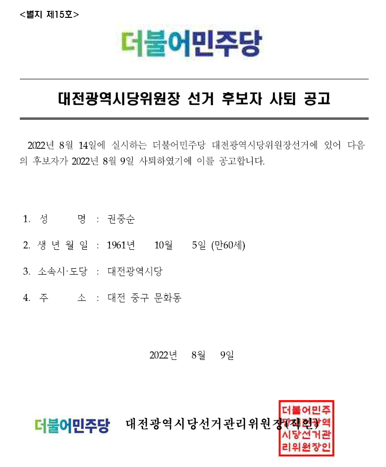 대전광역시당위원장 선거 후보자 사퇴 공고