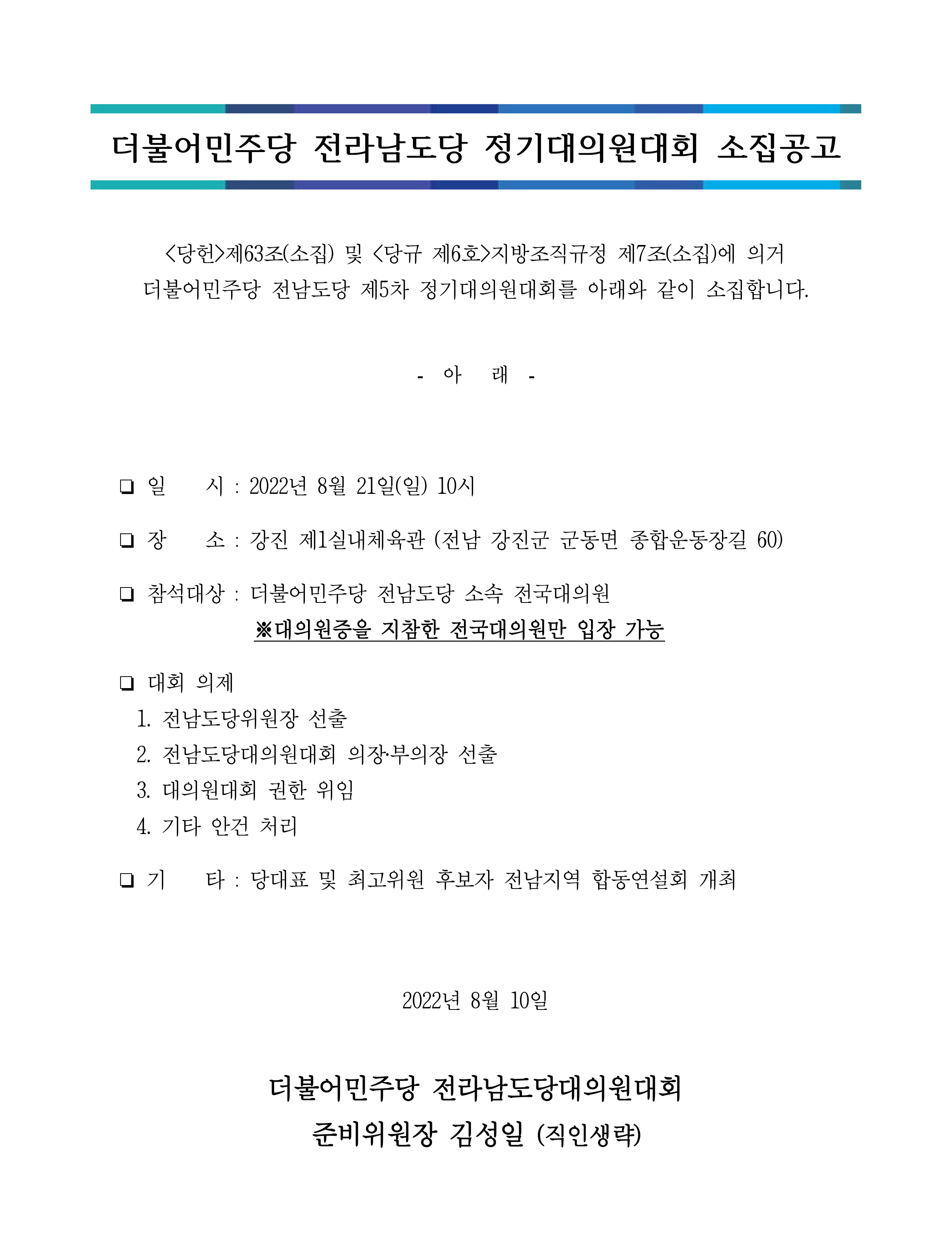 더불어민주당 전라남도당 정기대의원대회 소집공고
