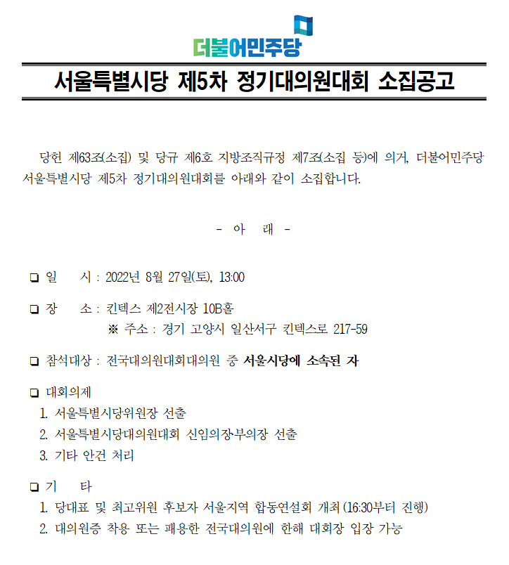 더불어민주당 서울특별시당 제5차 정기대의원대회 소집공고