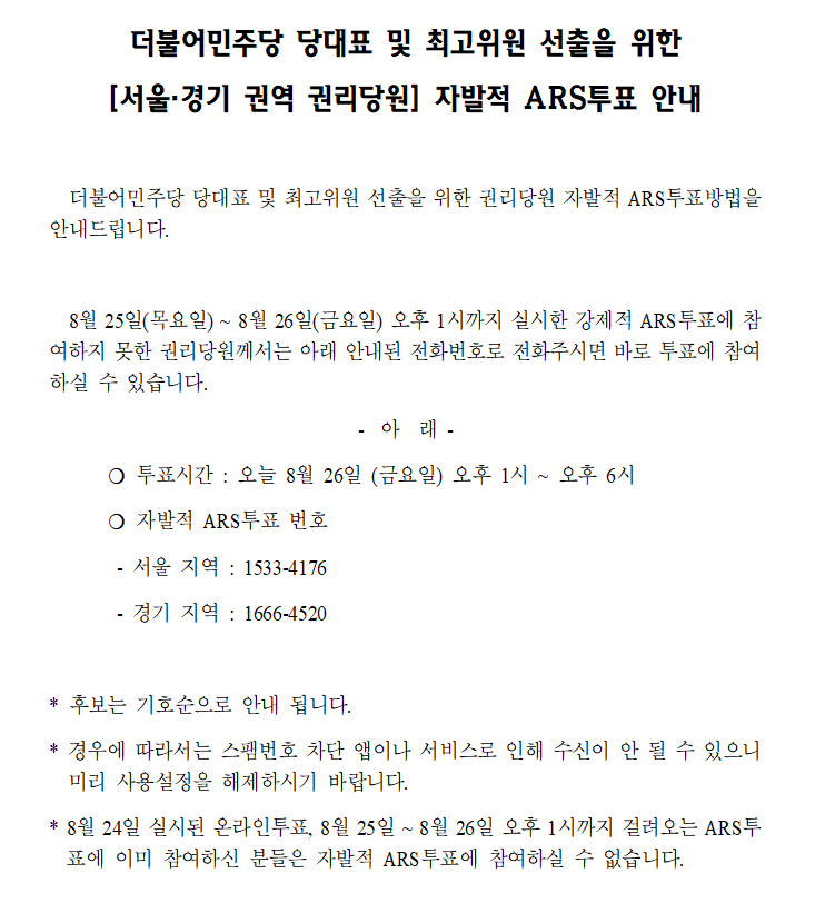 더불어민주당 당대표 및 최고위원 선출을 위한 [서울·경기 권역 권리당원] 자발적 ARS투표 안내