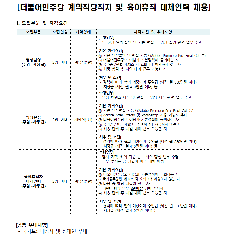더불어민주당 계약직 공개채용 공고
