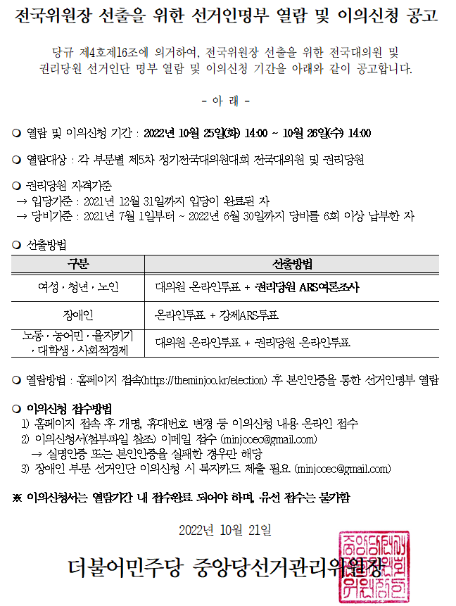 전국위원장 선출을 위한 선거인 명부 열람 및 이의신청 공고