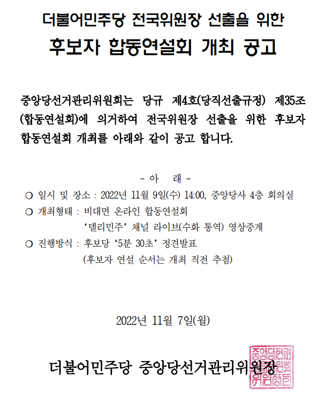 더불어민주당 전국위원장 선출을 위한 후보자 합동연설회 개최 공고