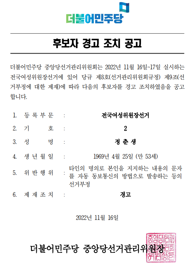 전국위원장(전국여성위원장 부문) 선거 후보자 경고 조치 공고