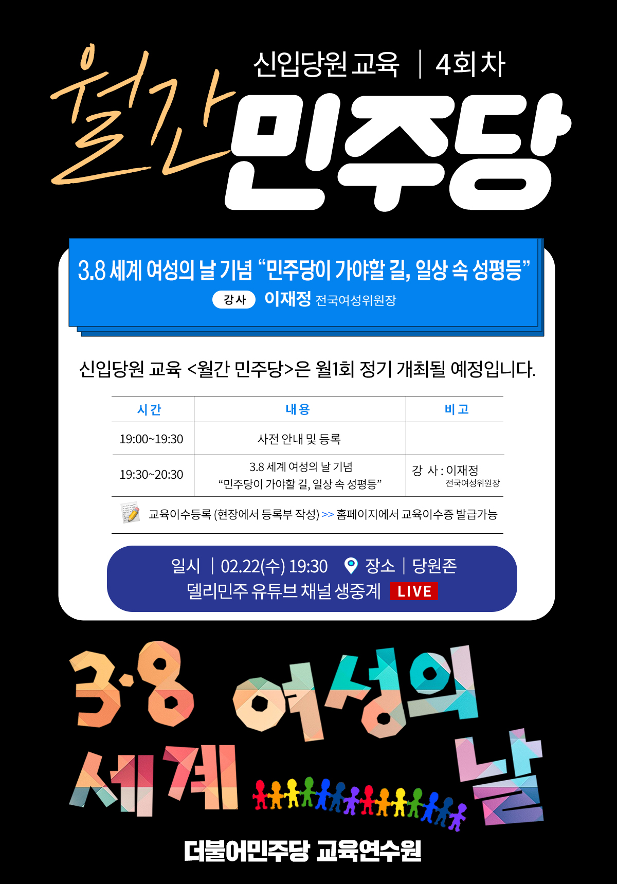 신입당원 교육 월간민주당 4회 : 3·8 세계 여성의 날 기념 "민주당이 가야할 길, 일상 속 성평등"