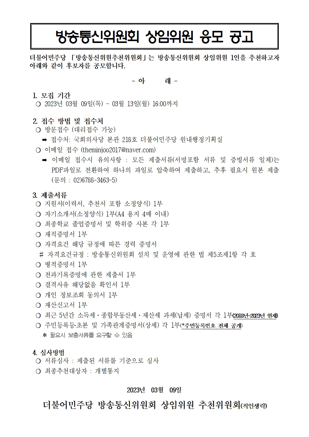 방송통신위원회 상임위원 응모 공고