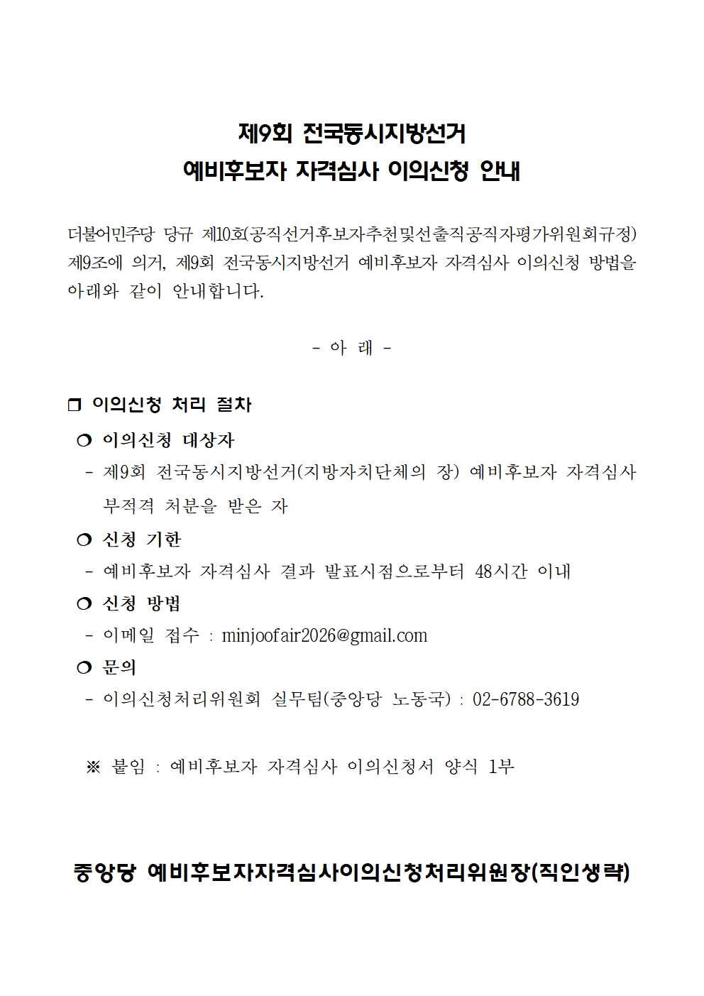 제9회 전국동시지방선거 예비후보자 자격심사 이의신청 안내