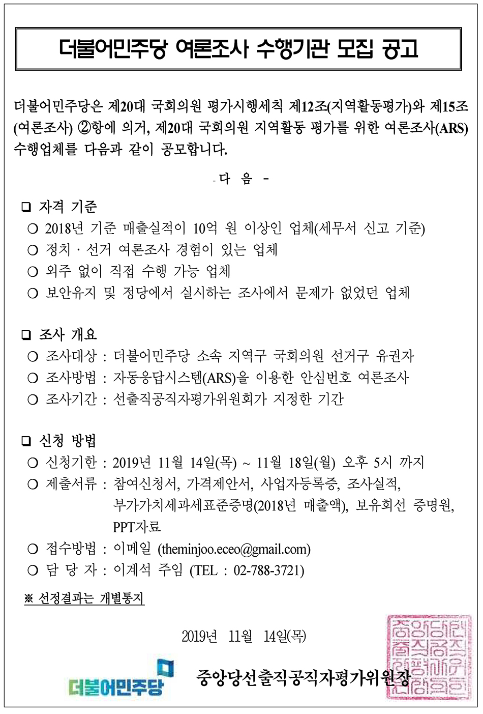 더불어민주당 여론조사 수행기관 모집 공고