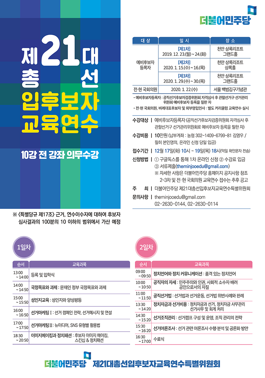 더불어민주당 「제21대총선입후보자교육연수특별위원회」는 제21대 총선 입후보자를 대상으로 교육연수를 아래와 같이 진행합니다. 모든 입후보자는 ‘의무적으로’ 본 교육연수를 이수하여야 합니다.