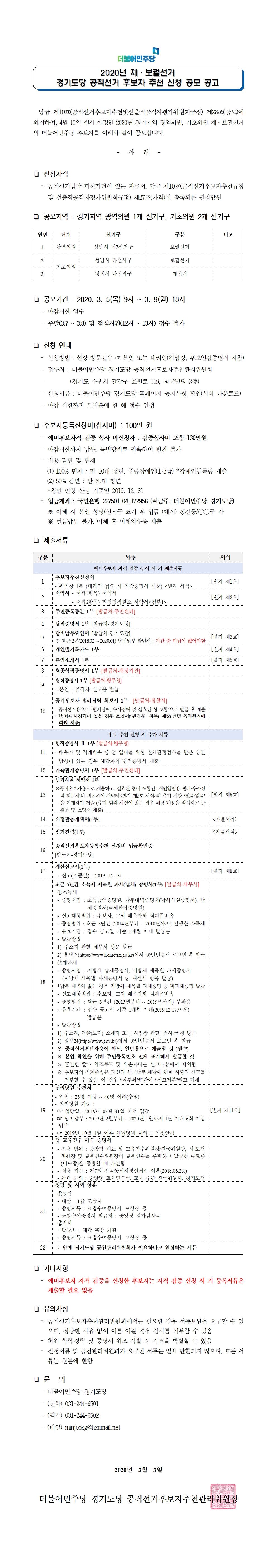2020년 재보궐선거 경기도당 공직선거 후보자 추천 신청 공모 공고