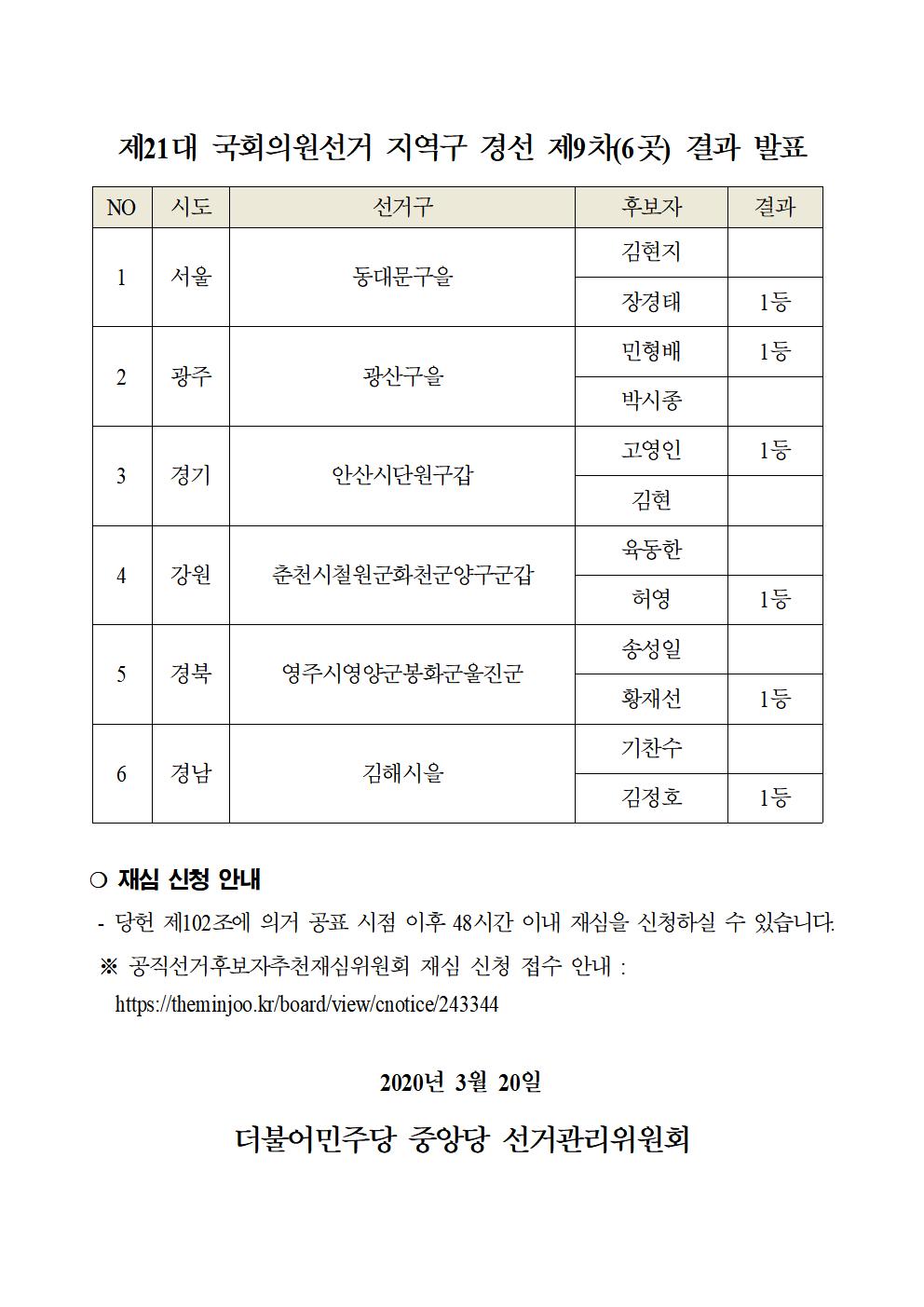 제21대 국회의원선거 지역구 후보자 경선 9차 결과 발표