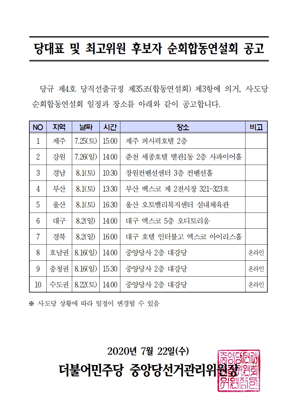 대표 및 최고위원 후보자 순회합동연설회 공고(08.21 17:57 일부 변경)