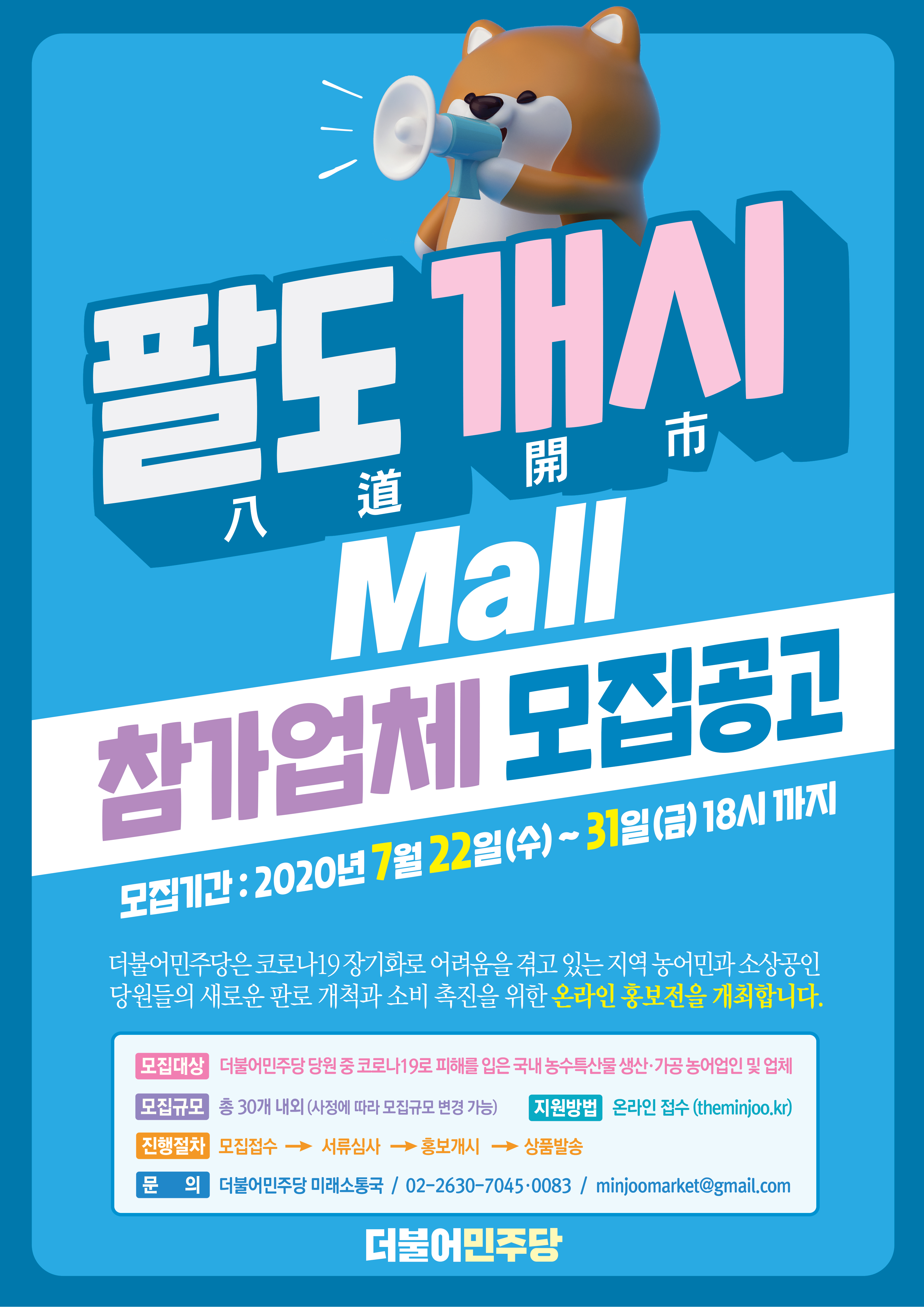 더불어민주당은 코로나19로 어려움을 겪고 있는 국내 농어민과 소상공인 당원들의 판로 지원을 위하여 『팔도개시(開市) Mall』 행사에 참가할 업체를 모집 공고합니다. 관심있는 업체들의 많은 참여 바랍니다.