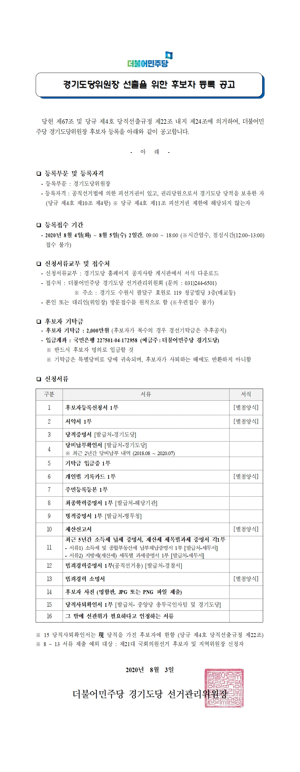 더불어민주당 경기도당위원장 선출을 위한 후보자 등록 공고
