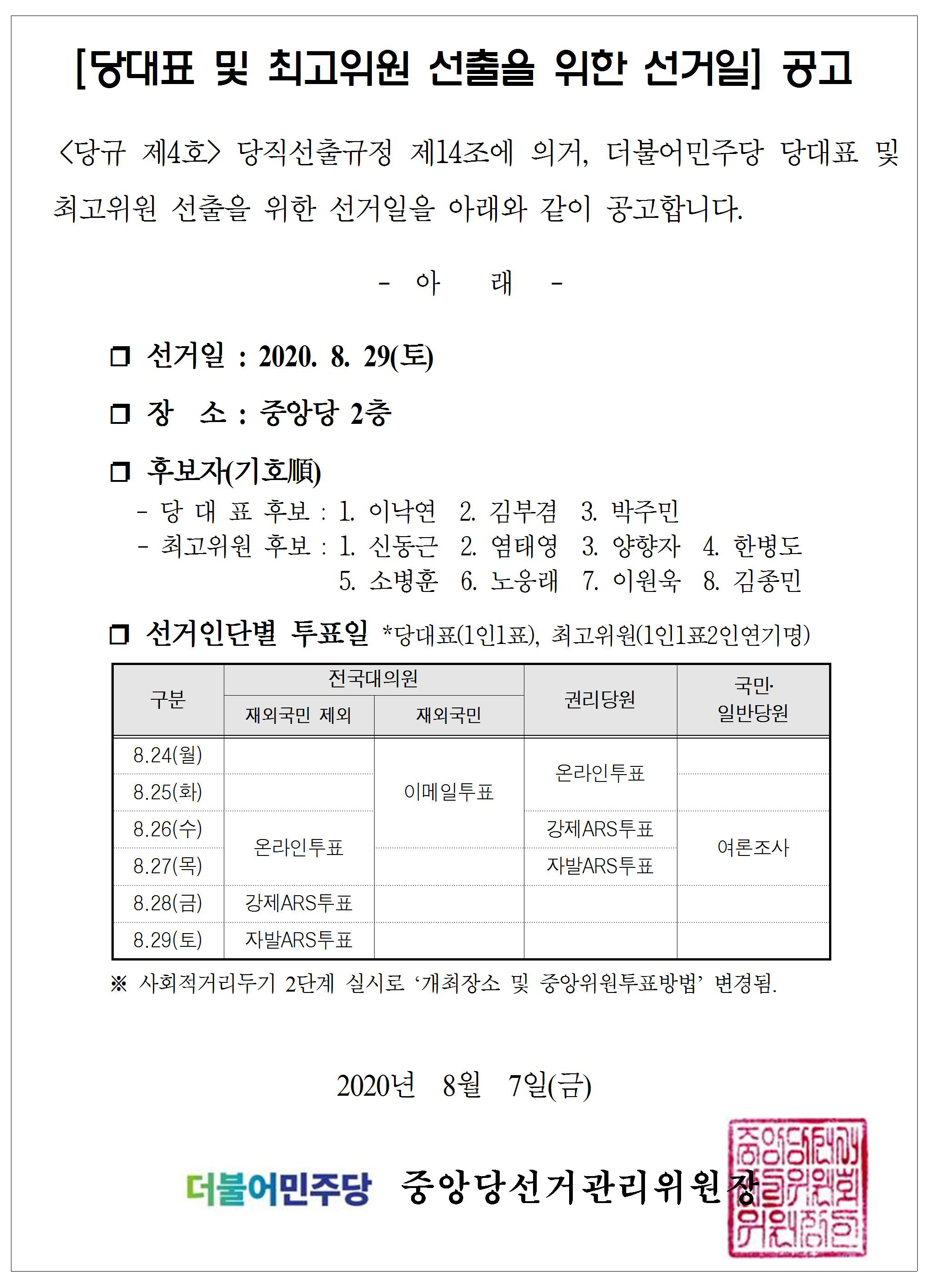 당대표 및 최고위원 선출을 위한 선거일 공고
