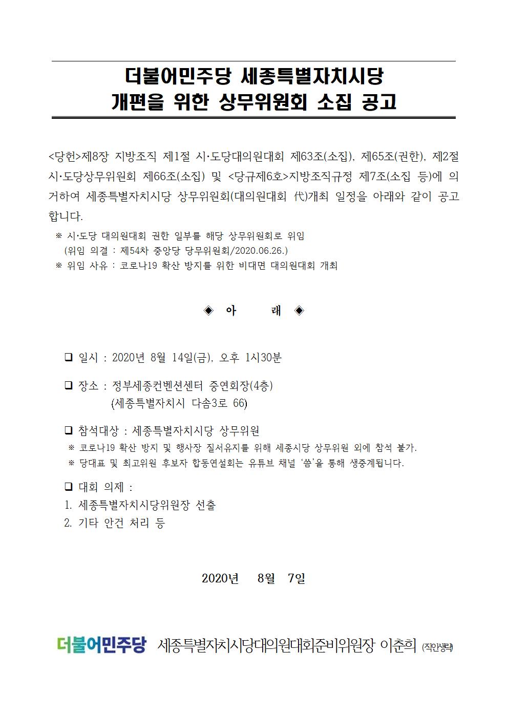 더불어민주당 세종특별자치시당 상무위원회 소집 공고