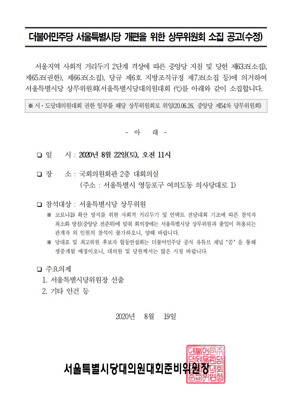 더불어민주당 서울특별시당 개편을 위한 상무위원회 소집 공고