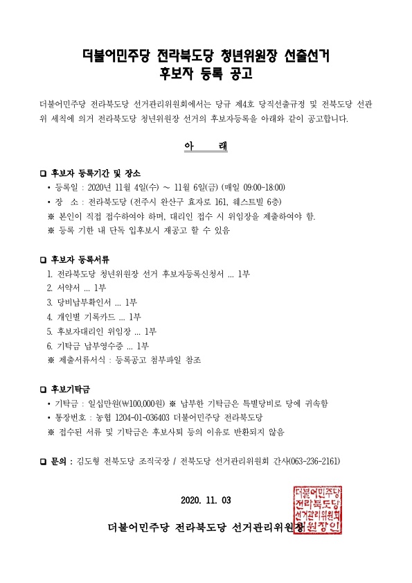 전북도당 청년위원장 선출 후보자 등록공고