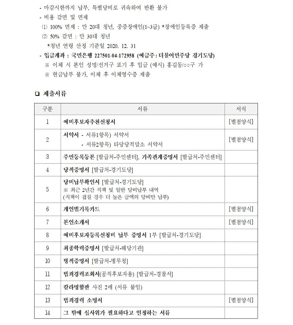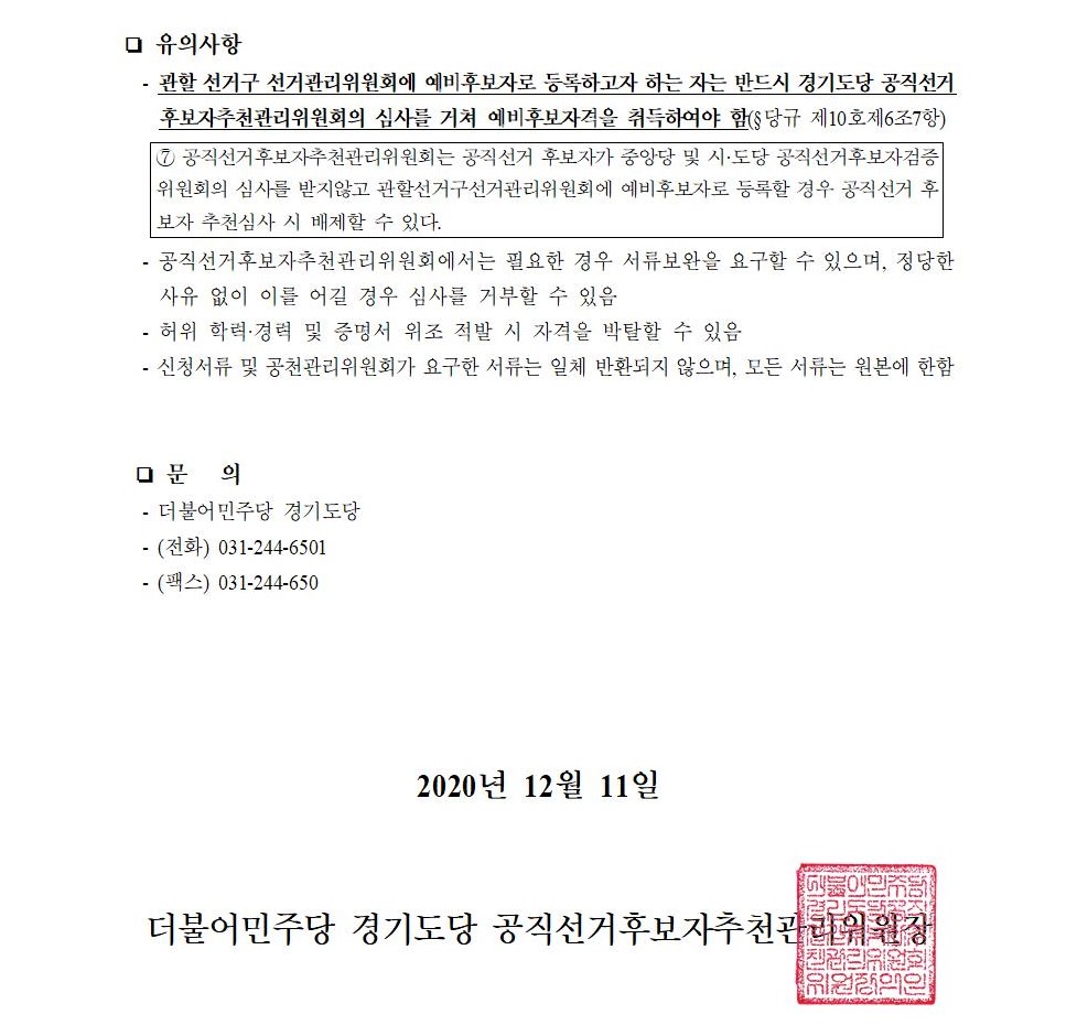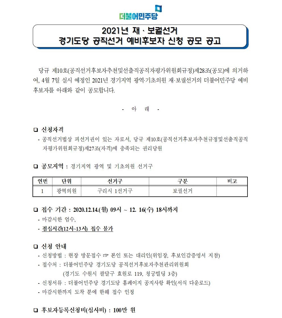 2021년 재·보궐선거 경기도당 공직선거 예비후보자 신청 공모 공고 (광역)