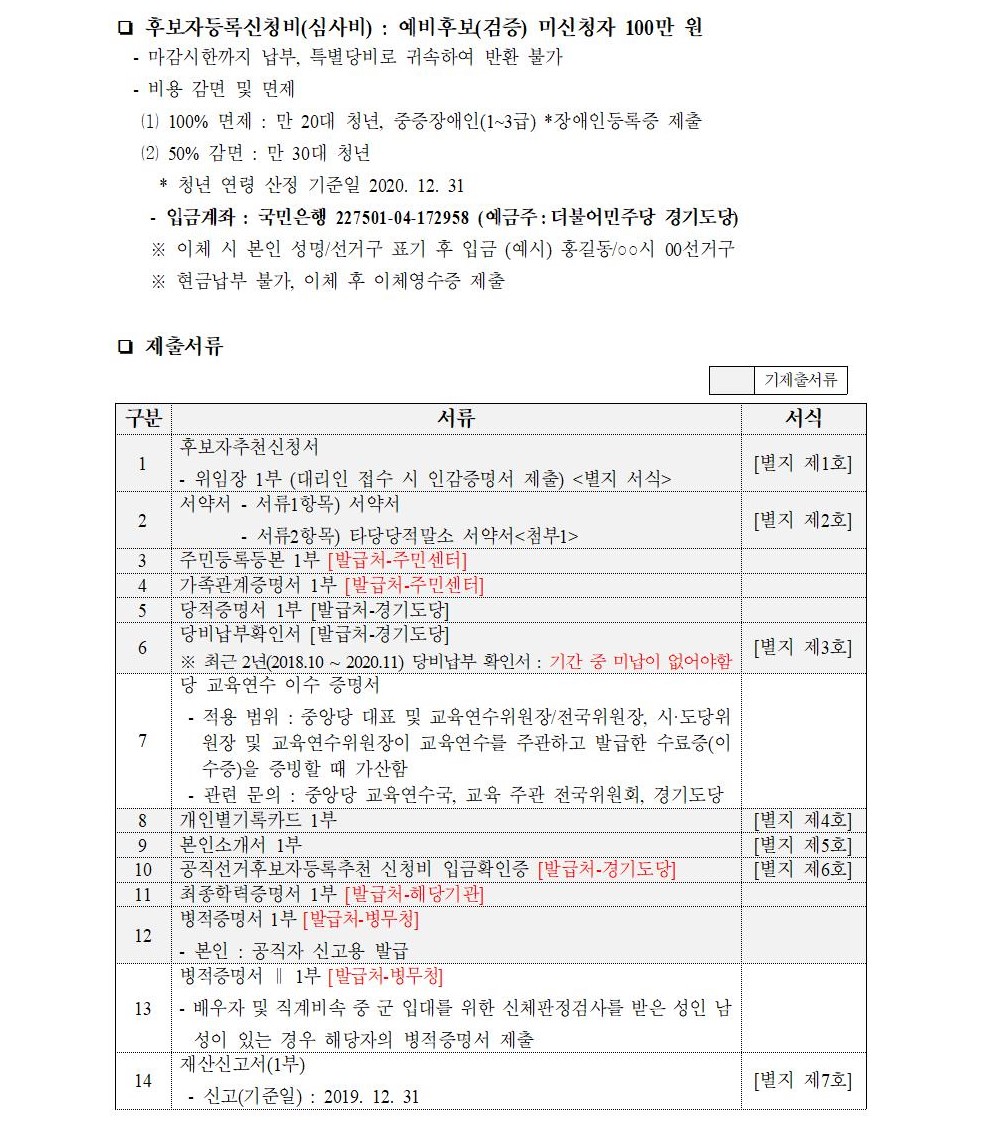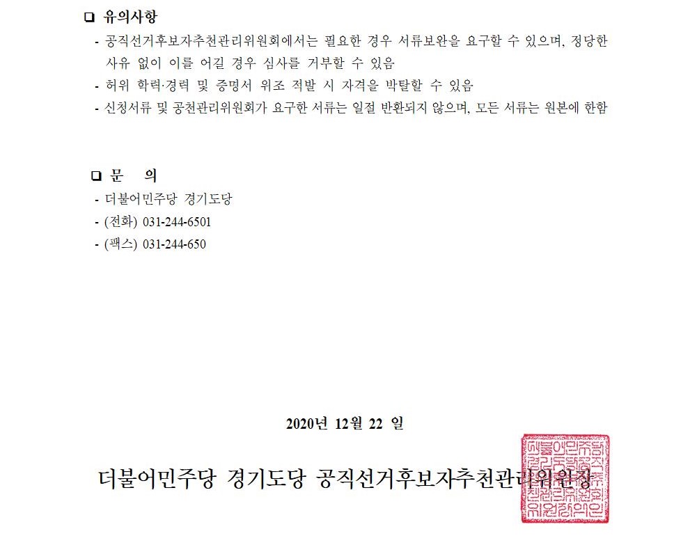 2021년 재보궐선거 경기도당 공직선거후보자 추천신청 공모 공고