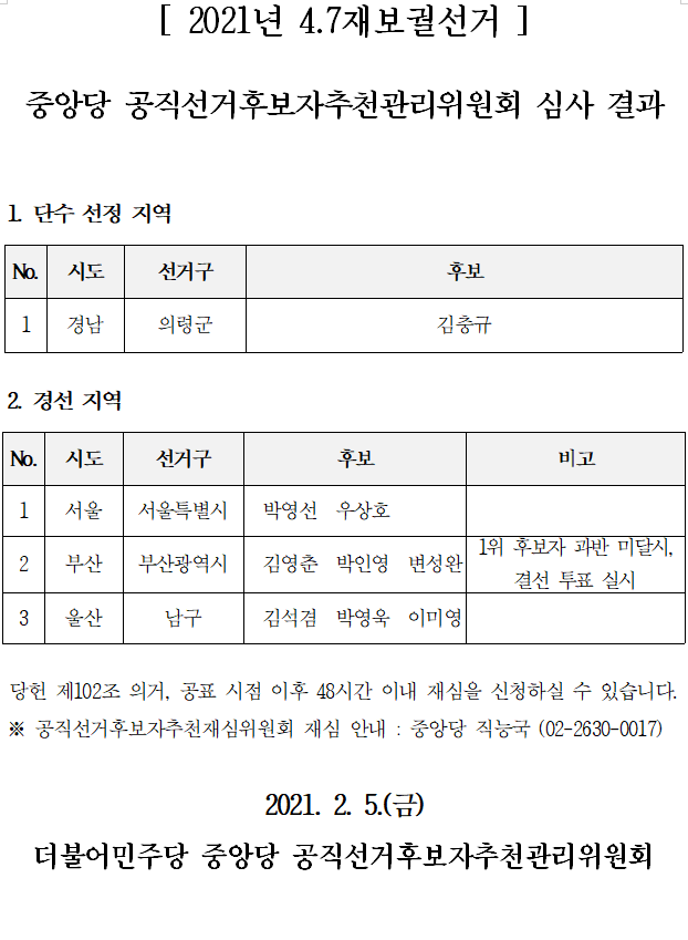[4.7 재보궐선거] 중앙당 공직선거후보자추천관리위원회 심사 결과