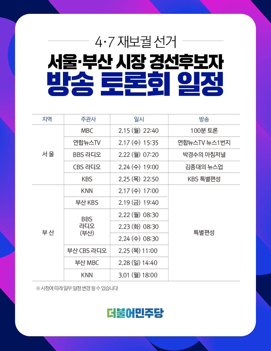 4.7 재보궐선거 서울·부산시장 예비후보자 방송토론회 일정안내