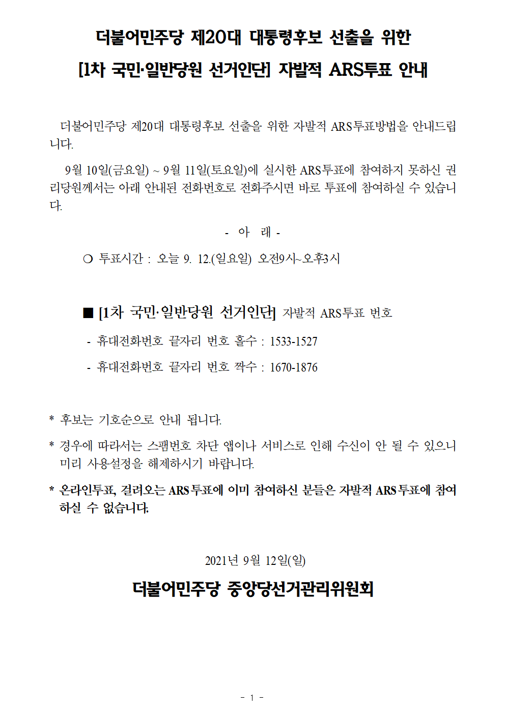 더불어민주당 제20대 대통령후보 선출을 위한 [1차 국민·일반당원 선거인단] 자발적 ARS투표 안내