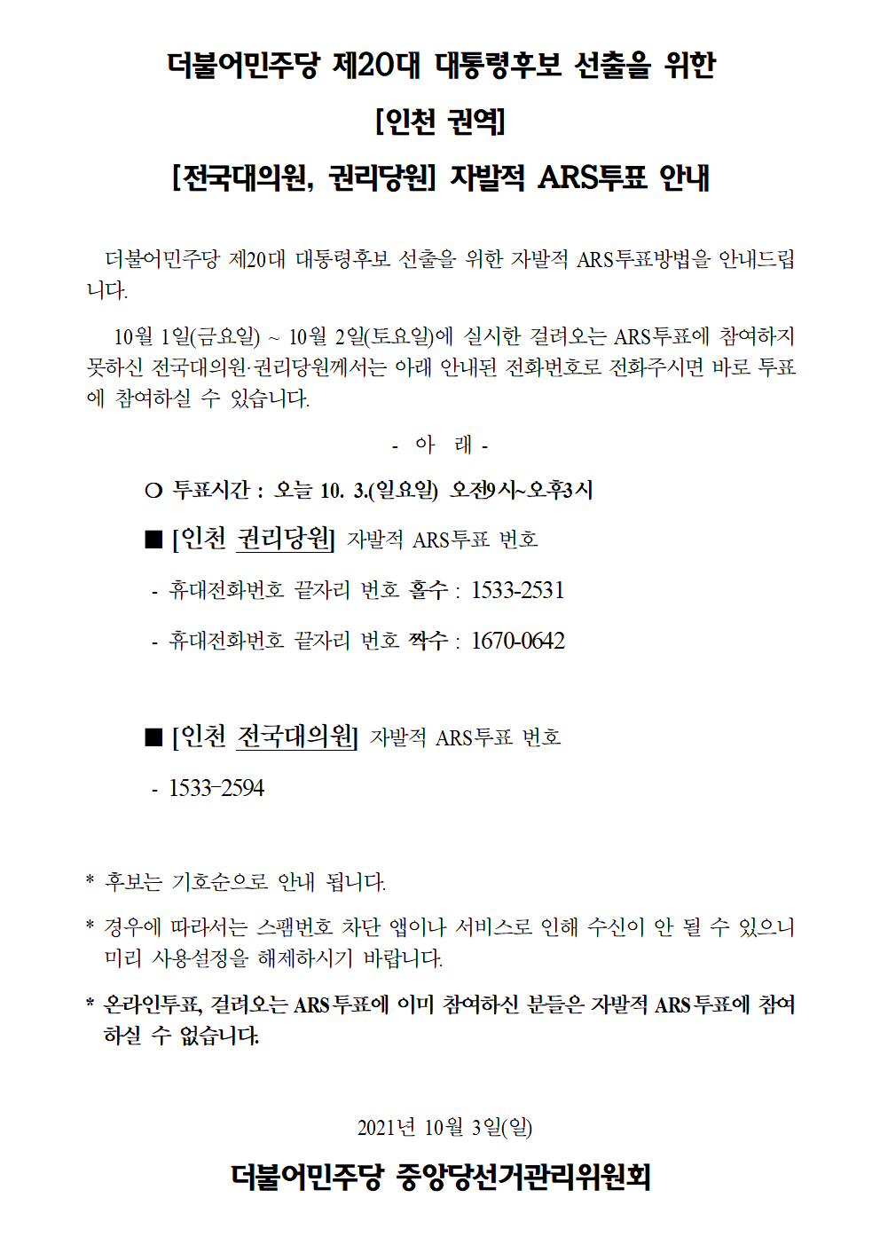 더불어민주당 제20대 대통령후보 선출을 위한 [인천 권역] 자발적 ARS투표 안내