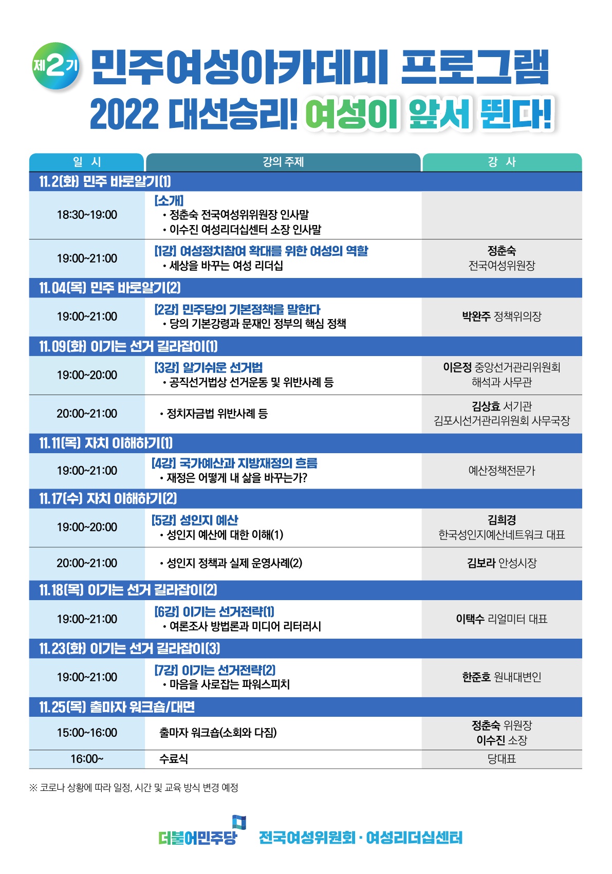 주관 및 주최 : 더불어민주당 전국여성위원회, 여성리더십센터