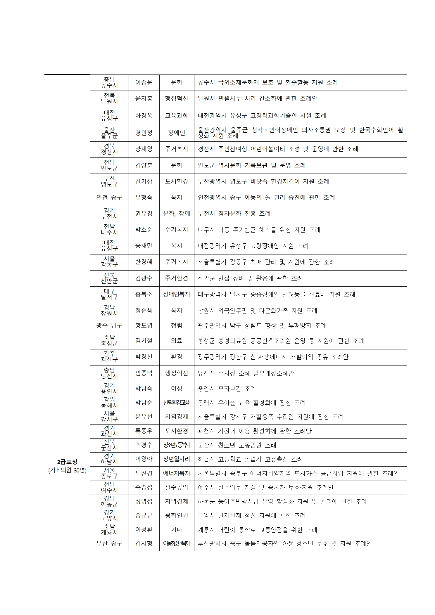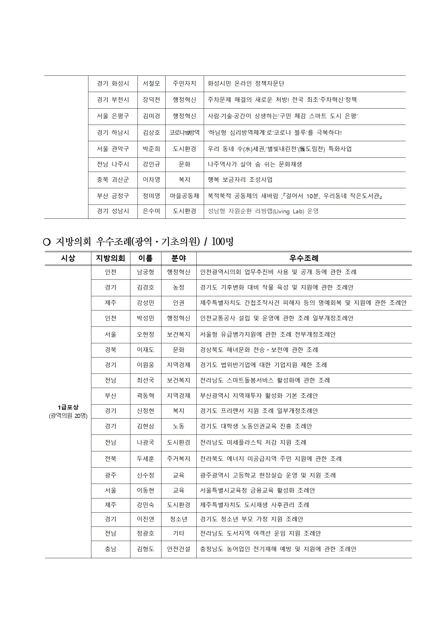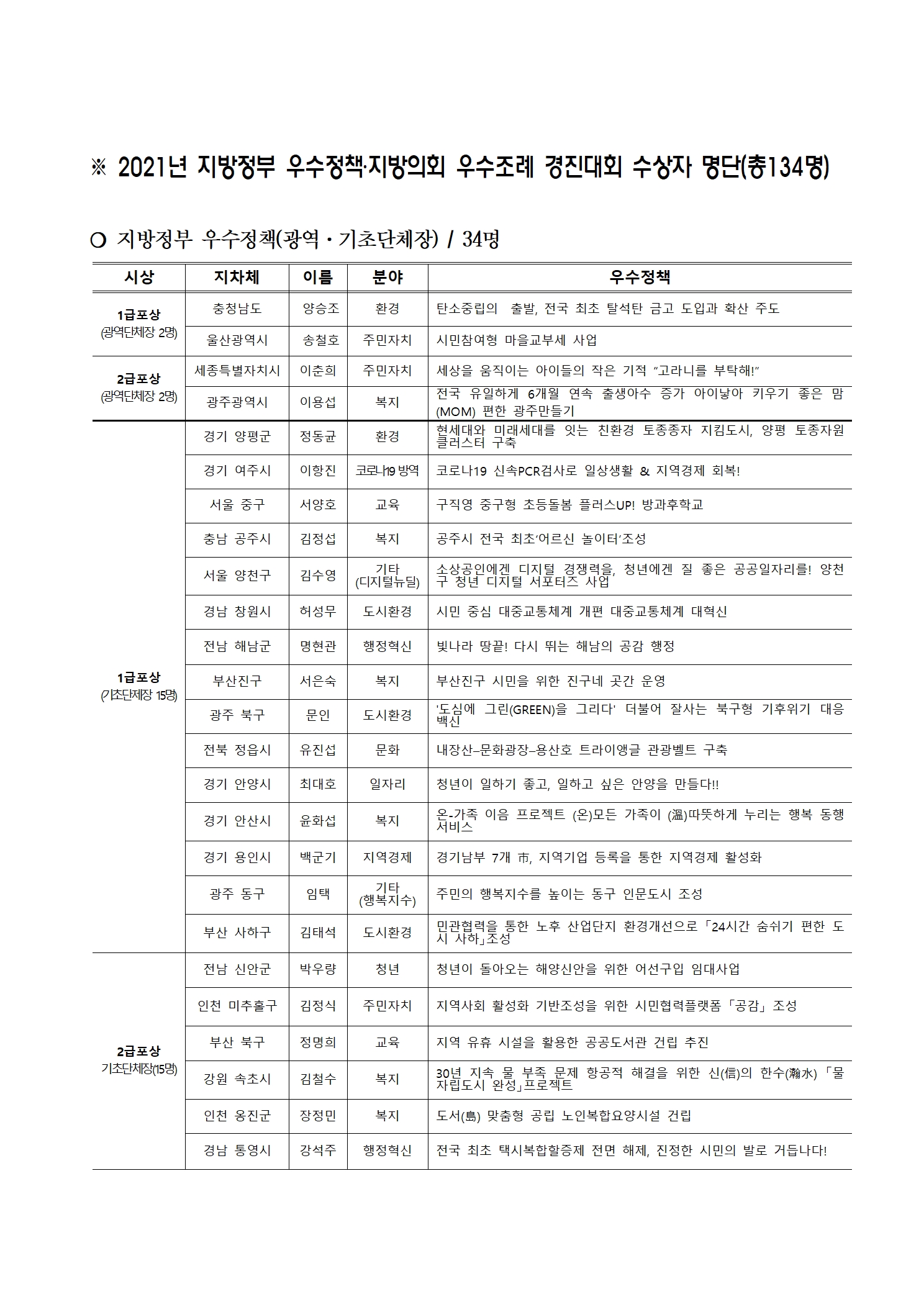 2021 지방정부 우수정책․지방의회 우수조례 경진대회 수상자 공지(수정)