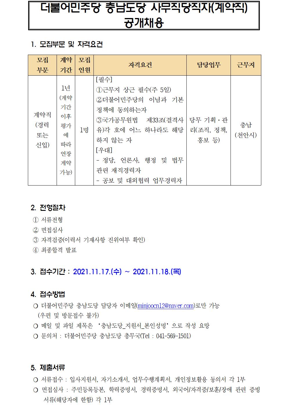 더불어민주당 충남도당 사무직당직자(계약직) 공개채용