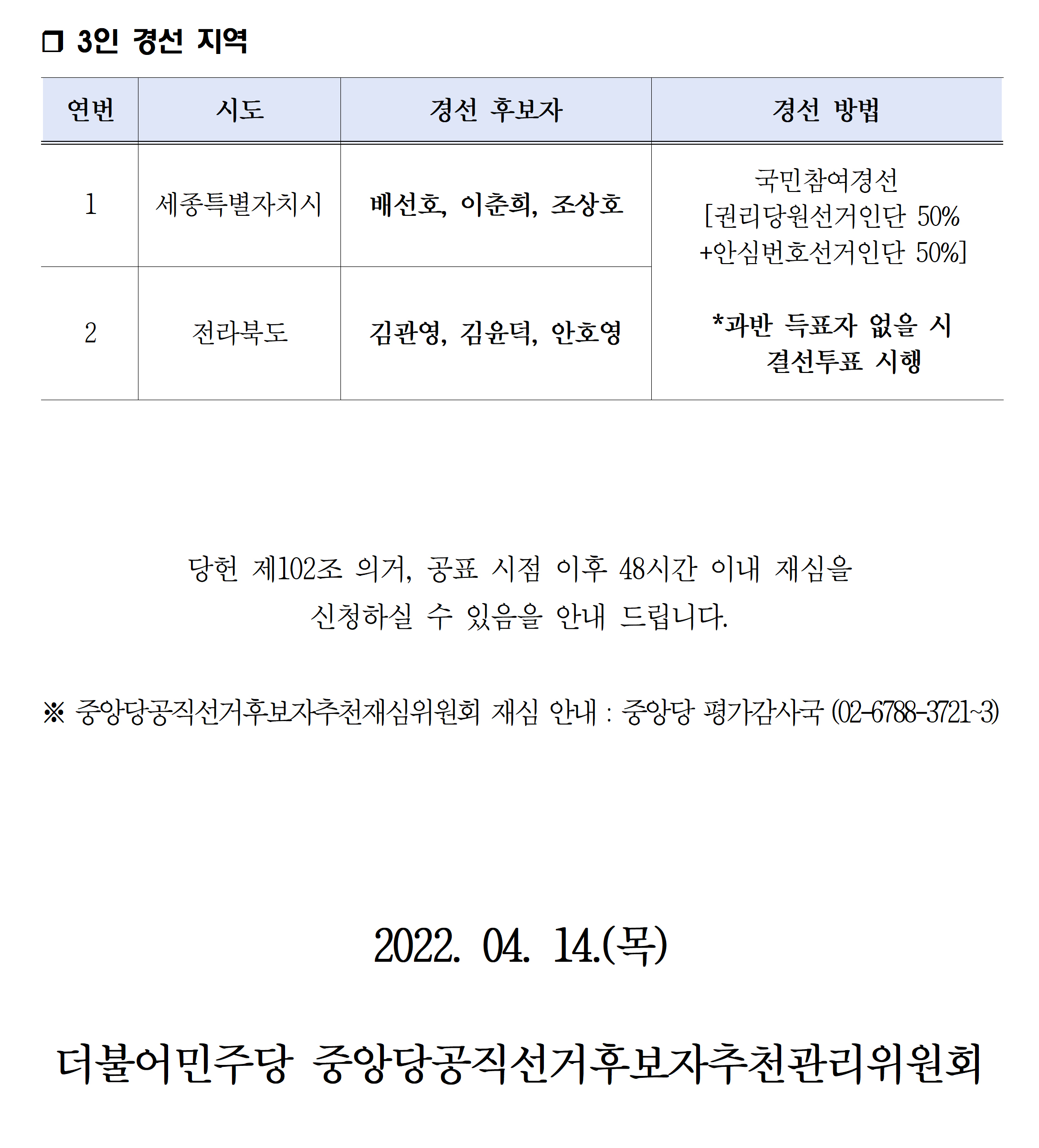 제8회 지방선거 광역단체장 후보자 선출을 위한 더불어민주당 중앙당공직선거후보자추천관리위원회 광역단체장 후보자 심사결과