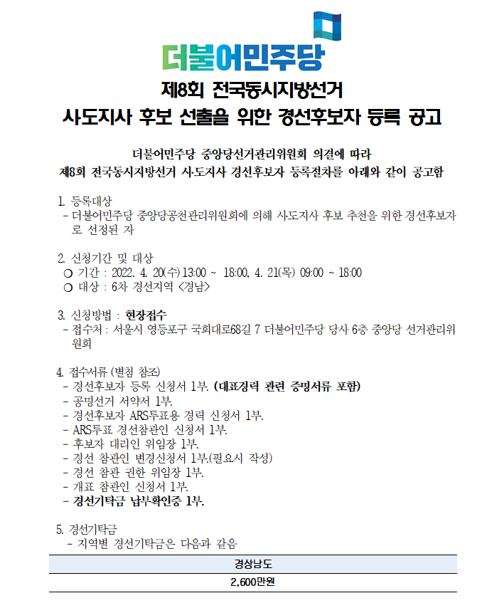 제8회 전국동시지방선거 시․도지사 후보 선출을 위한 경선후보자 등록 공고