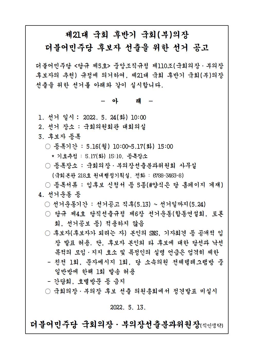 제21대 국회 후반기 국회(부)의장 더불어민주당 후보자 선출을 위한 후보자등록 공고