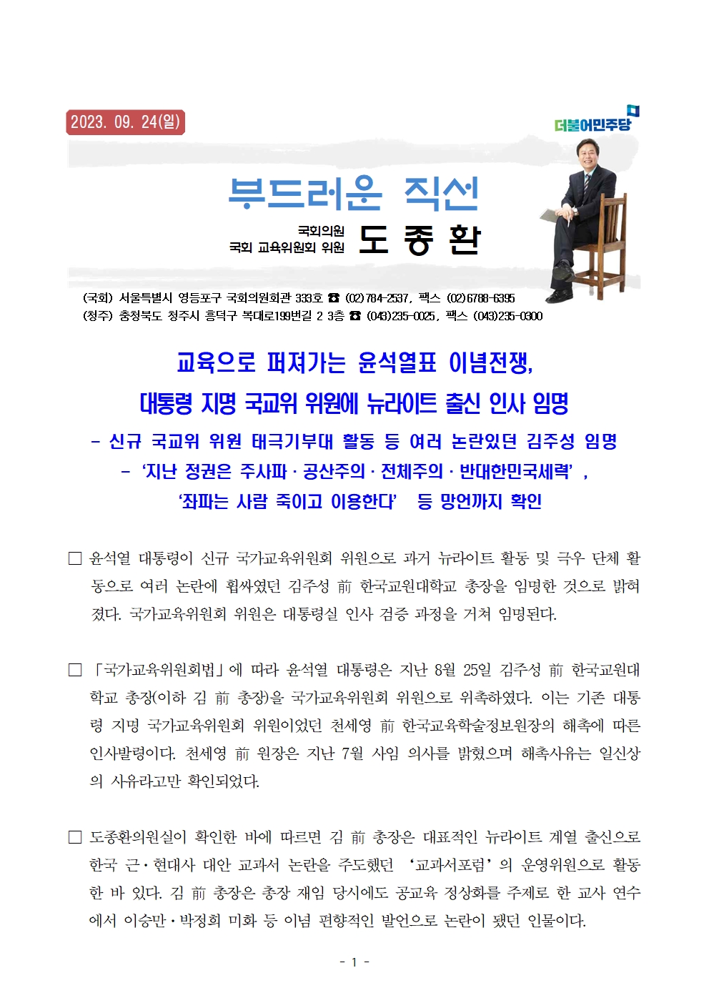 230924 [도종환의원 보도자료] 교육으로 퍼져가는 윤석열표 이념전쟁 대통령 지명 국교위 위원에 뉴라이트 출신 인사 임명.hwp