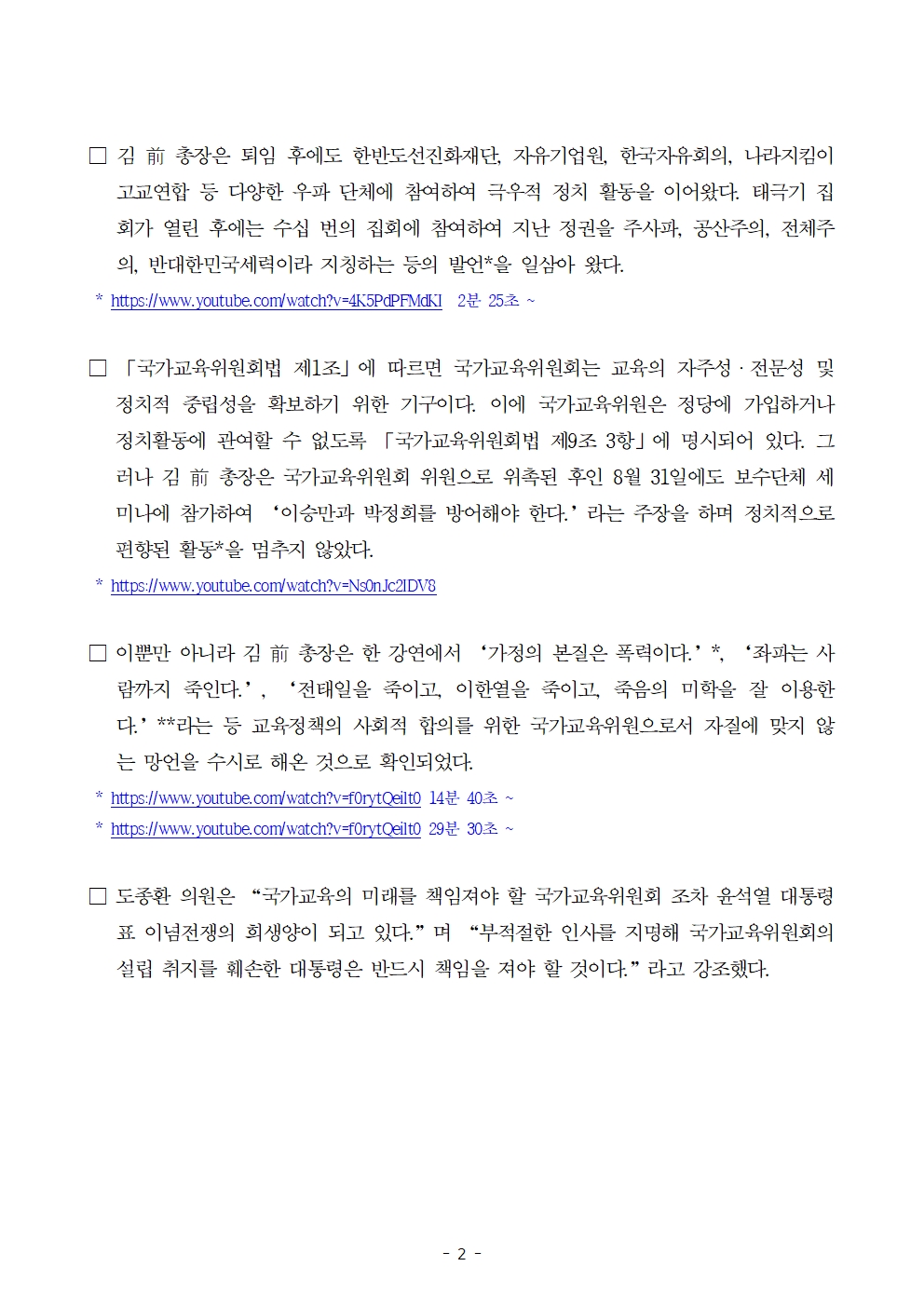 [도종환의원 보도자료] 교육으로 퍼져가는 윤석열표 이념전쟁, 대통령 지명 국교위 위원에 뉴라이트 출신 인사 임명