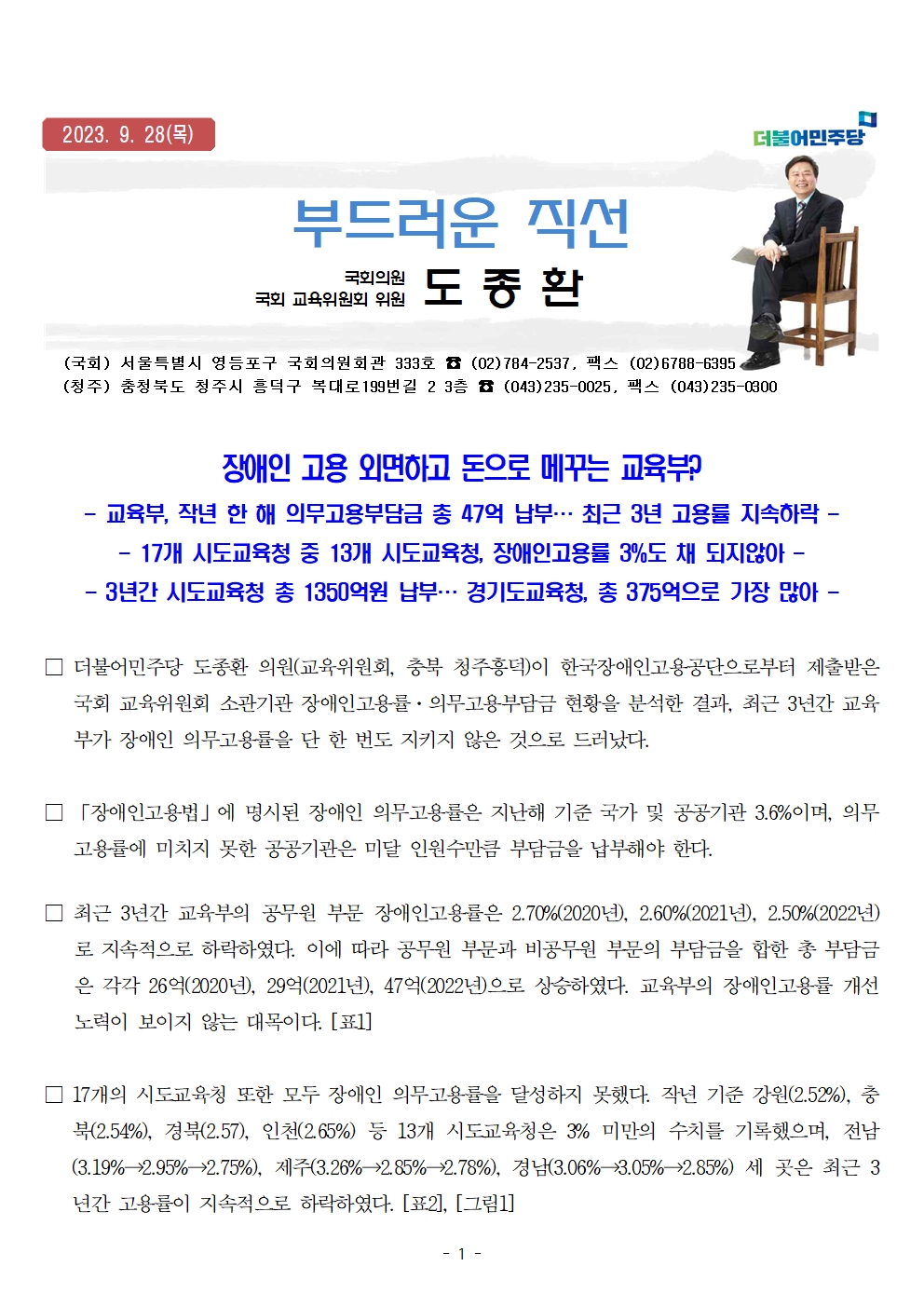 230928 [도종환의원 보도자료] 장애인 고용 외면하고 돈으로 메꾸는 교육부.hwp