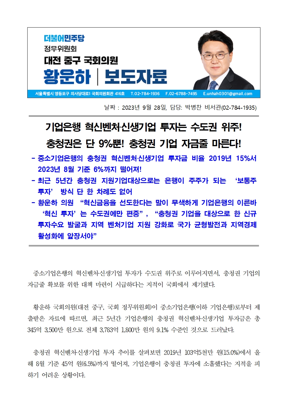 [황운하의원 보도자료] 기업은행 혁신벤처‧신생기업 투자는 수도권 위주! 충청권은 단 9%뿐! 충청권 기업 자금줄 마른다!