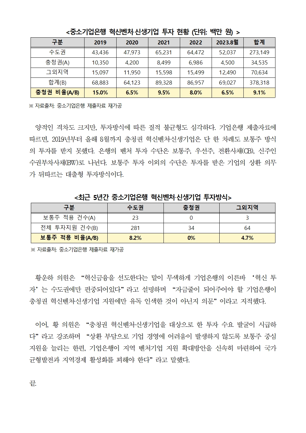 230928_중소기업은행 혁신벤처_신생기업 투자는 수도권 위주! 충청권은 단 9%뿐! 충청권 기업 자금줄 마른다!.hwp