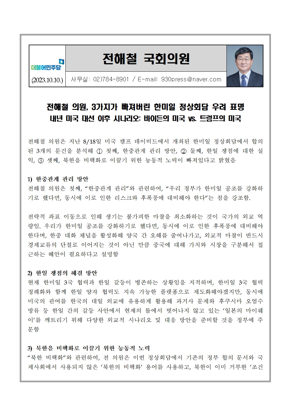 [전해철의원실보도자료]전해철 의원 3가지가 빠져버린 한미일 정상회담 우려 표명(2023.10.10.).hwp