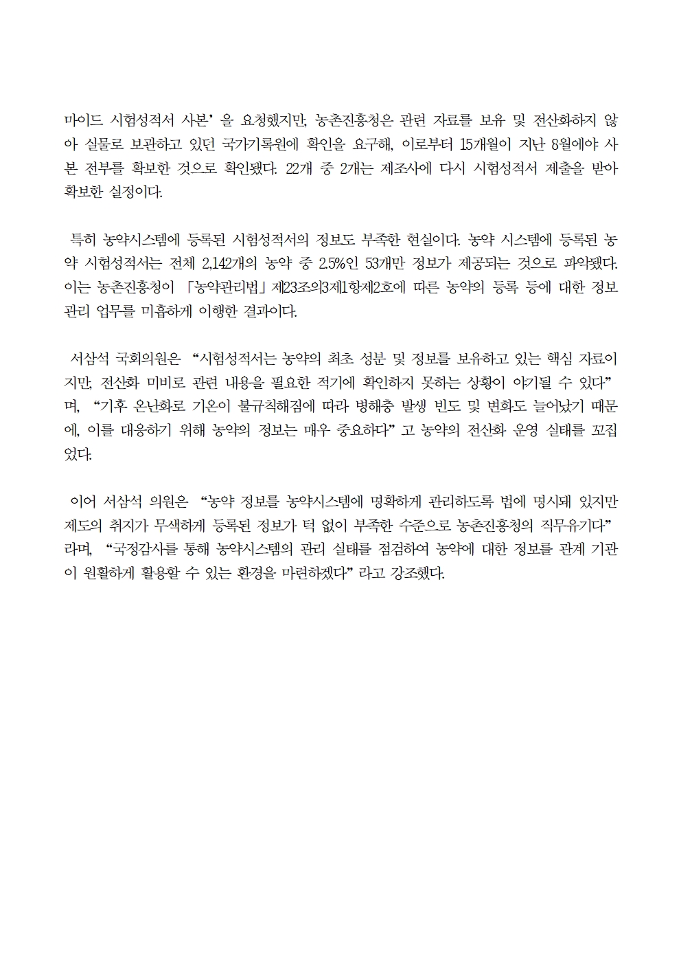 [서삼석의원실] 231002_농약시험성적서, 농약안전시스템에 97.5% 미등록