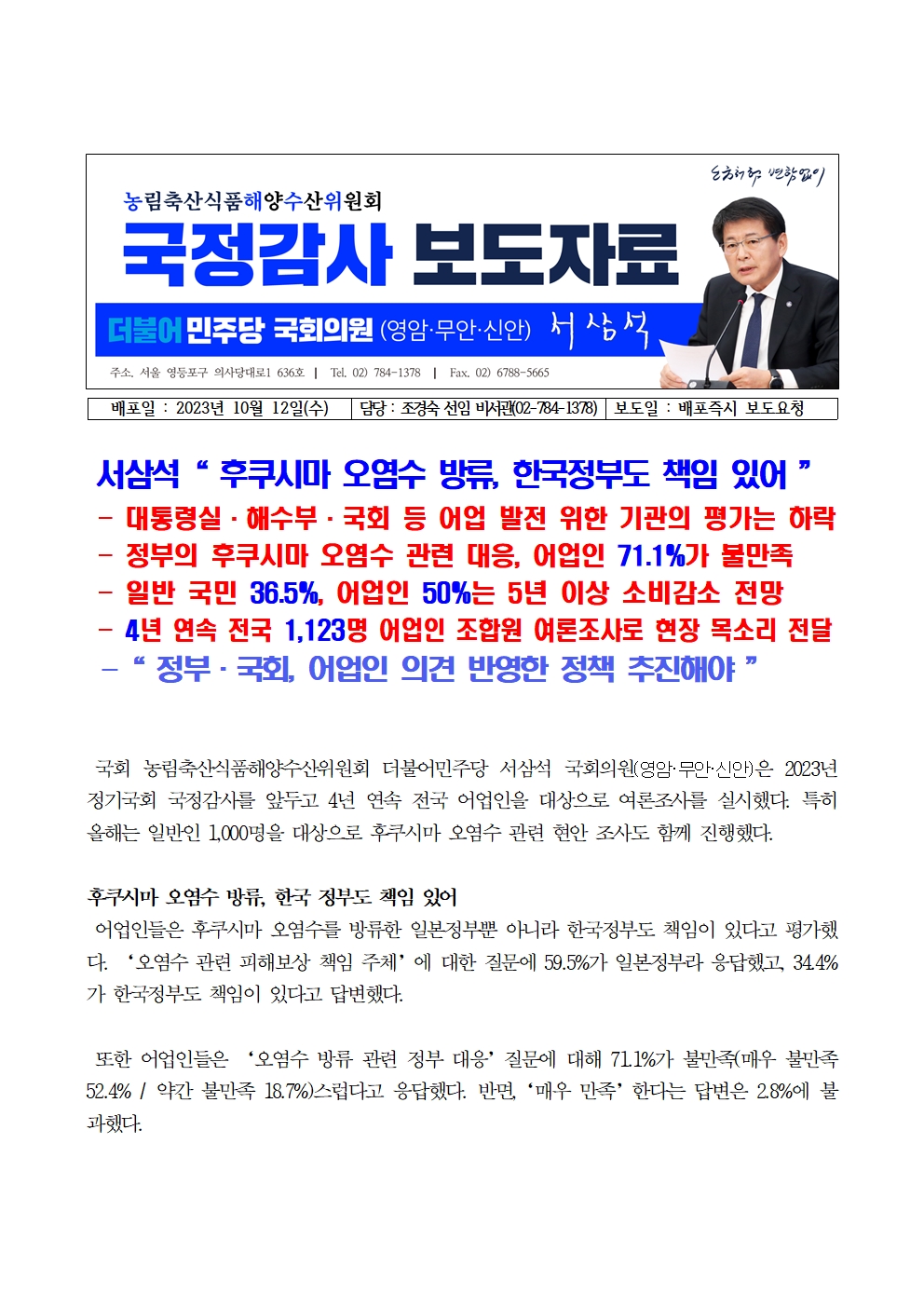 [서삼석의원실] 231012_서삼석“ 후쿠시마 오염수 방류, 한국정부도 책임 있어 ”