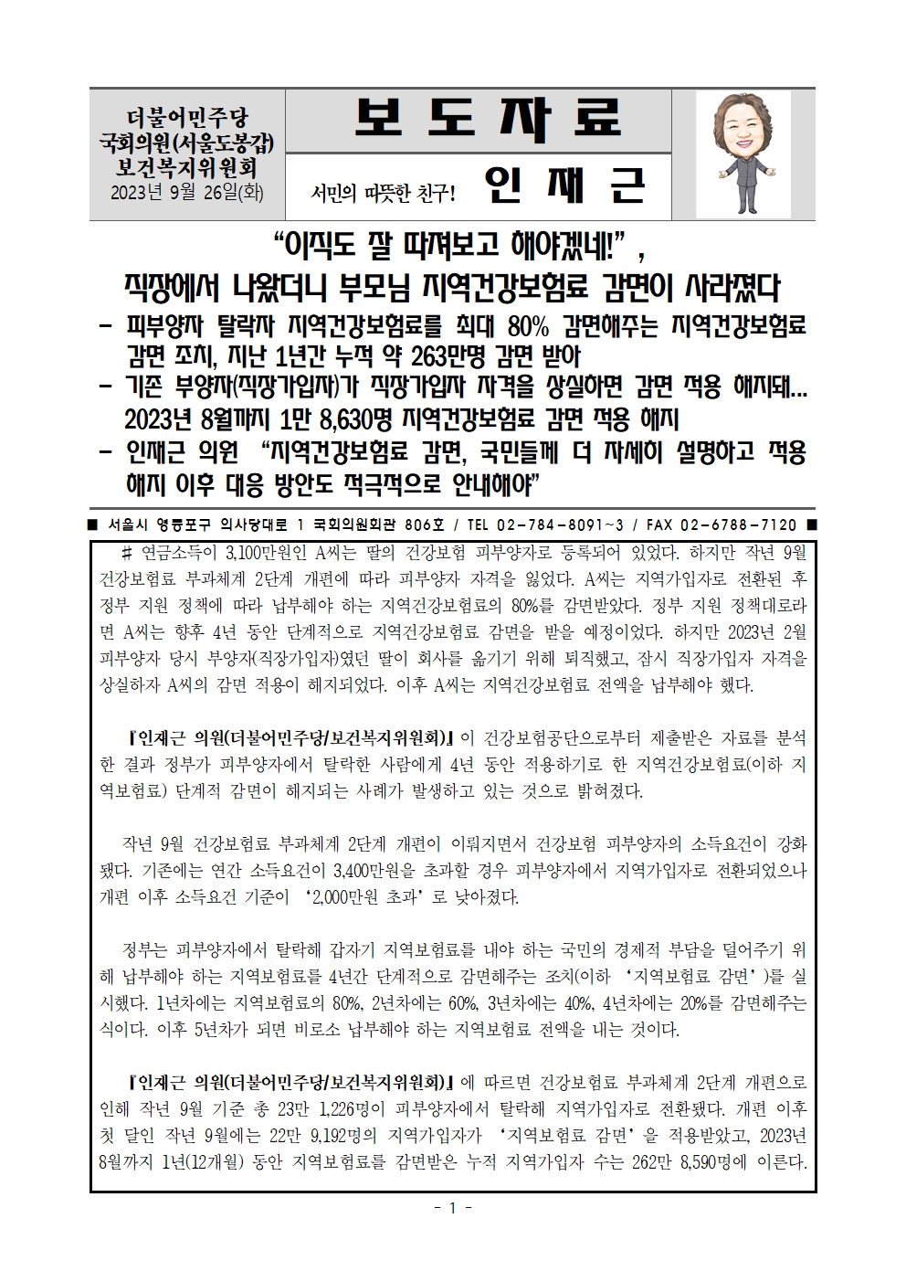 [인재근의원실 보도자료] “이직도 잘 따져보고 해야겠네!”, 직장에서 나왔더니 부모님 지역건강보험료 감면이 사라졌다