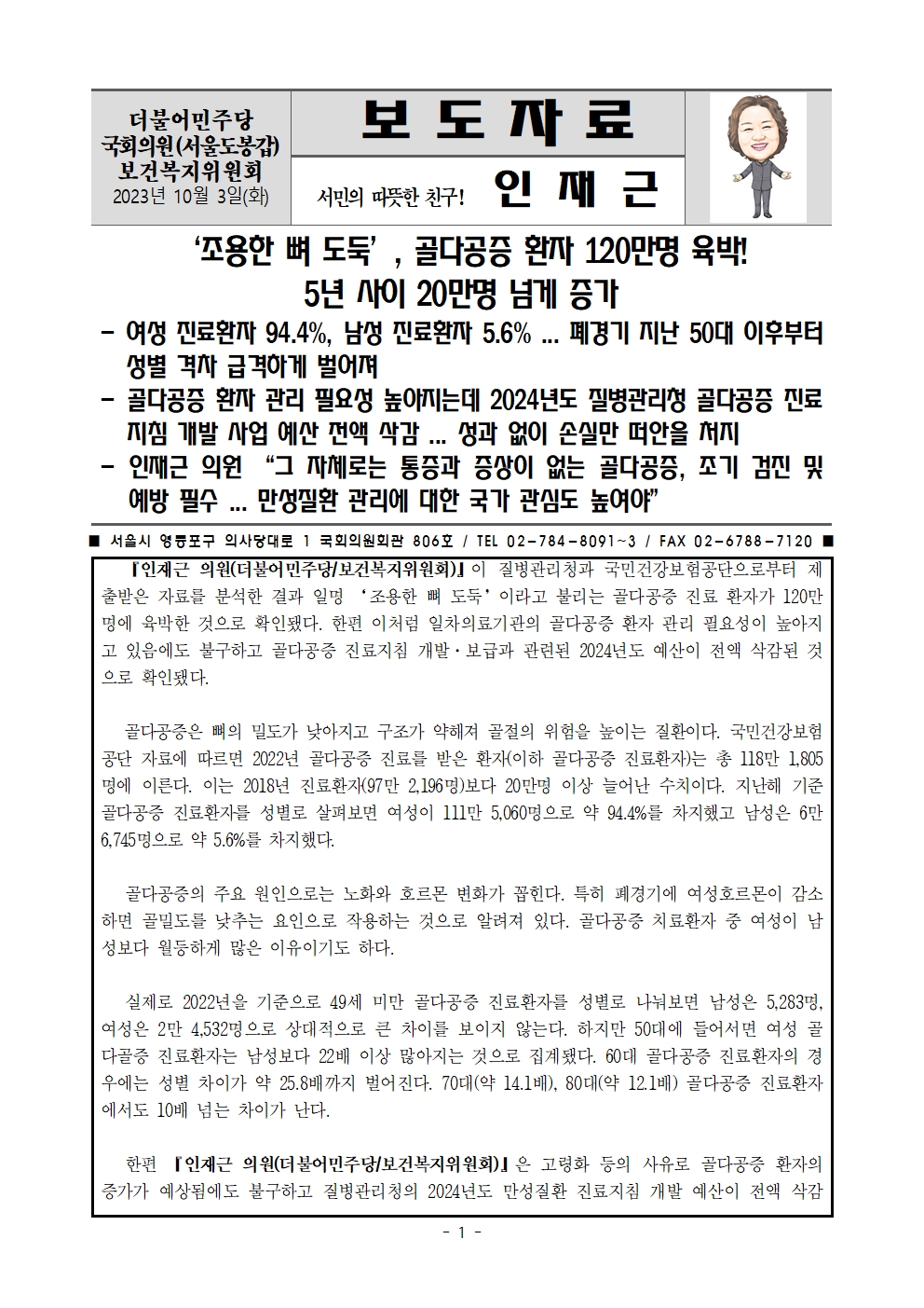 [인재근의원실 보도자료] ‘조용한 뼈 도둑’, 골다공증 환자 120만명 육박! 5년 사이 20만명 넘게 증가
