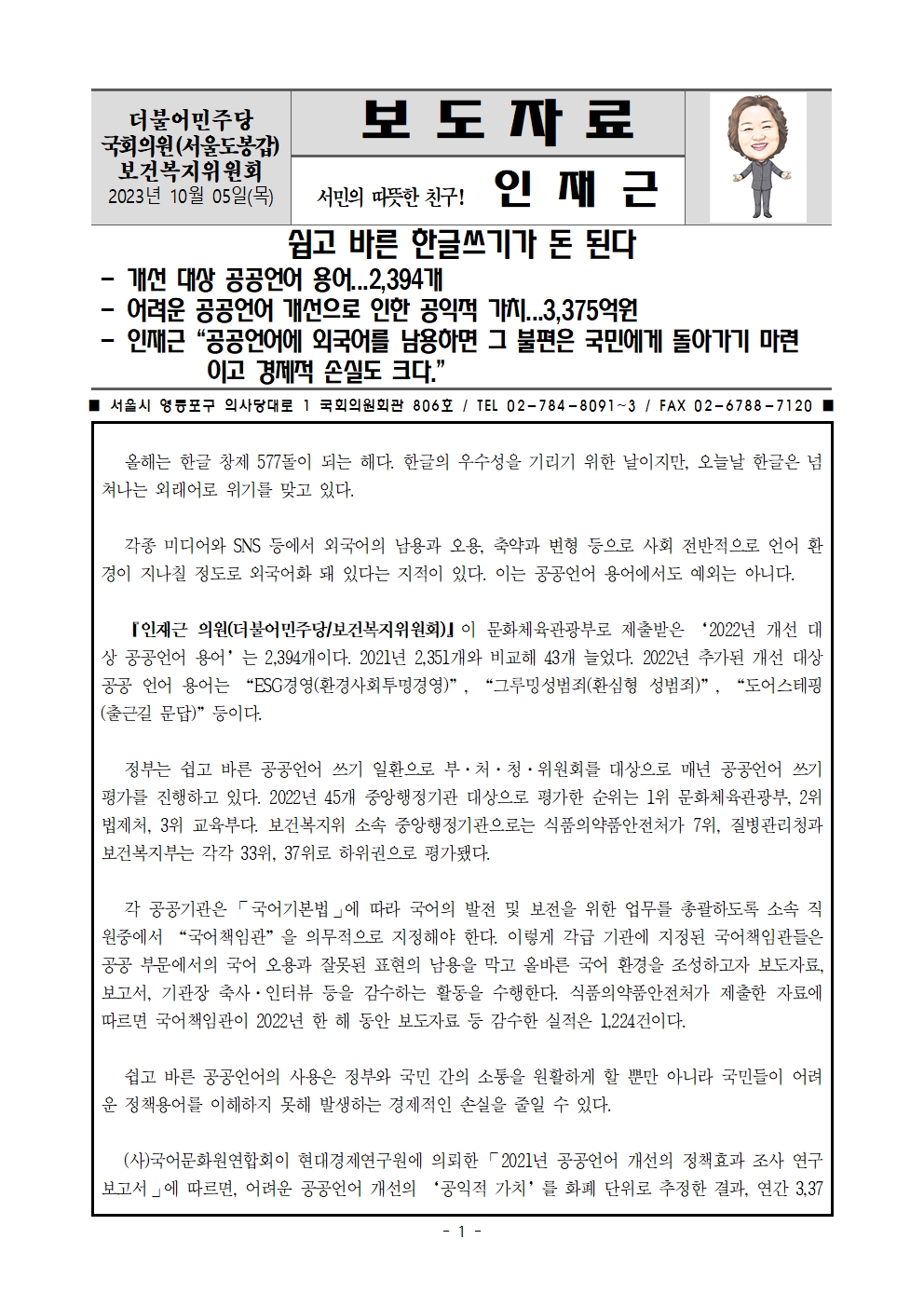 [인재근의원실 보도자료] 쉽고 바른 한글쓰기가 돈 된다