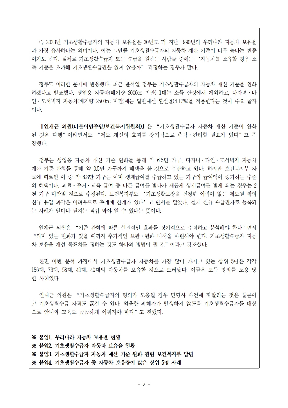 231009_[인재근의원실 보도자료] 기초생활수급자 12명이 겨우 자동차 1대 보유.hwp