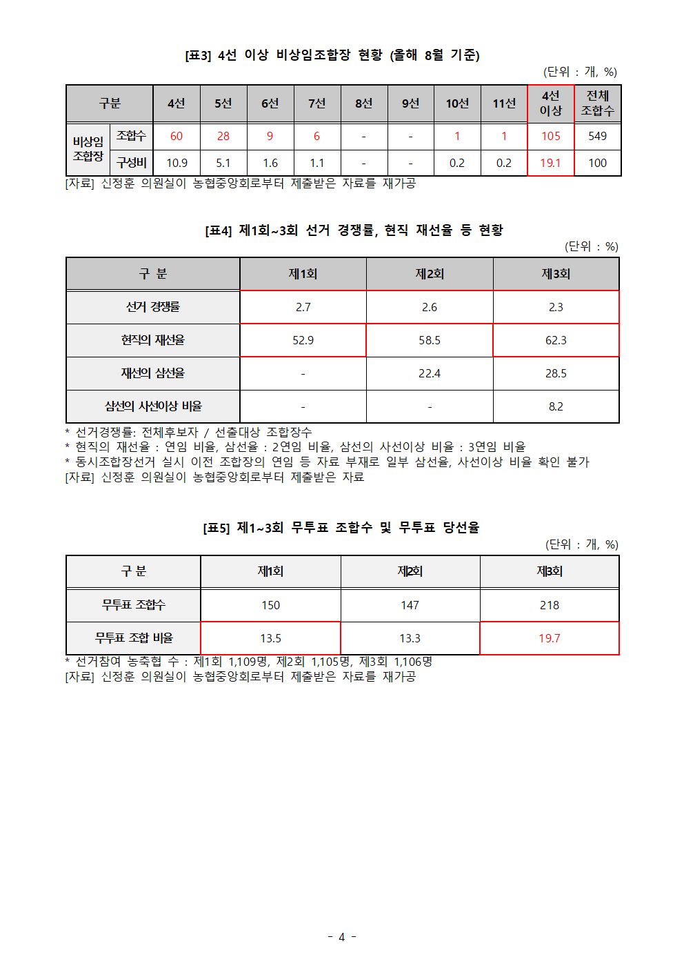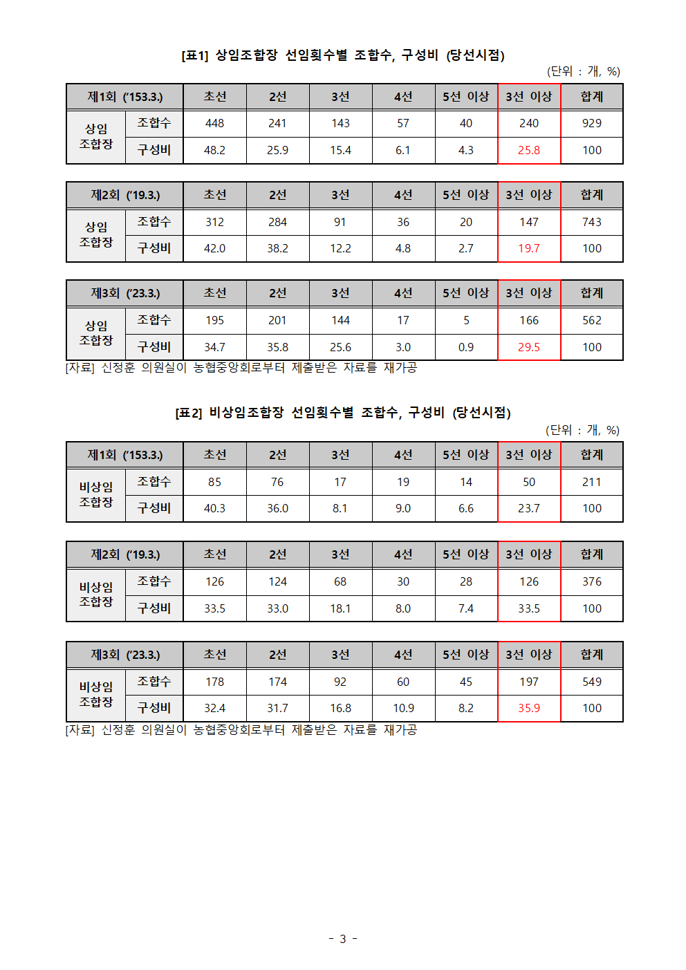 [신정훈 의원 보도자료] ‘무제한 연임’농협 비상임조합장 최대 11선 장기집권... 4선 이상 19%